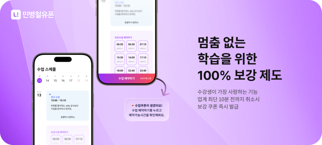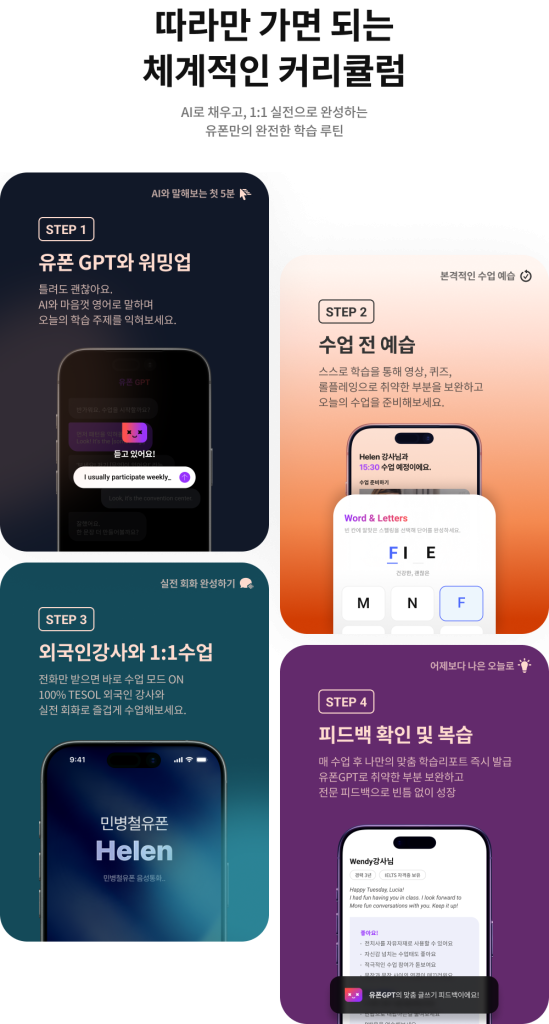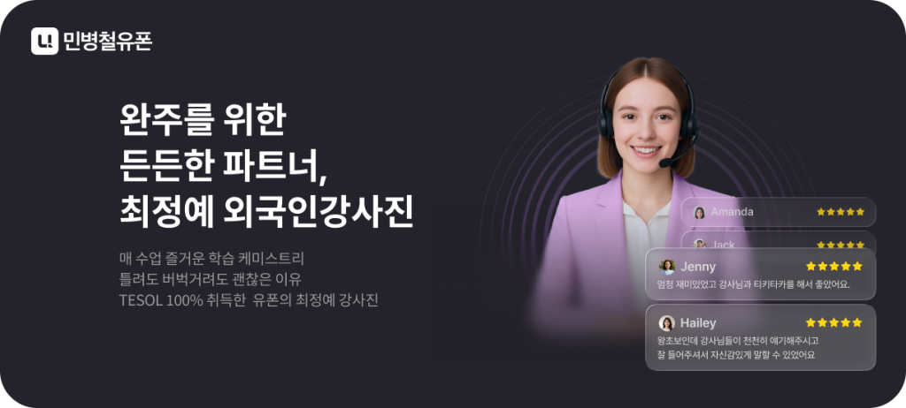위에서 언급한 3가지 기준을 가장 완벽하게 충족하는 서비스, 바로 민병철유폰입니다. 민병철유폰은 단순한 영어회화어플을 넘어, 기술과 사람이 결합된 최적의 학습 경험을 제공합니다.