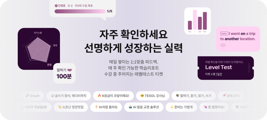 이처럼 원어민 영어회화의 뉘앙스와 대체 표현까지 꼼꼼하게 짚어주는 디테일한 피드백이 있어야 합니다. 내가 몰랐던 습관을 교정받고, 더 세련된 표현을 익히는 과정이 반복될 때 실질적인 실력 향상이 일어납니다.