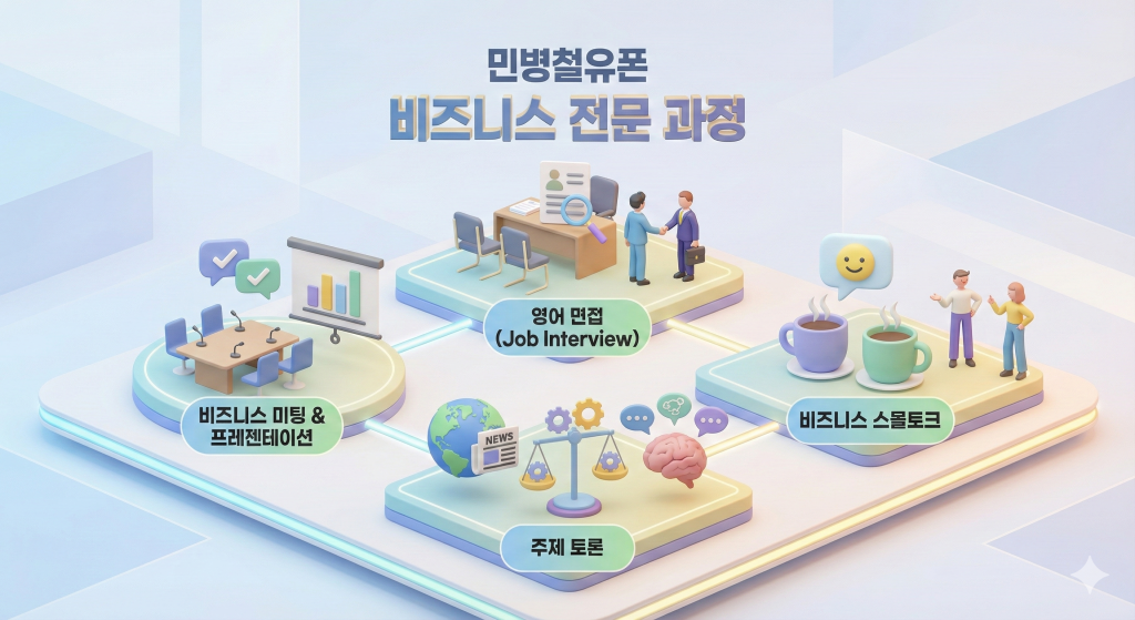민병철유폰은 단순히 원어민과 수다를 떠는 것이 아닙니다. 직장인 학습자들의 구체적인 니즈를 충족시키기 위해 세분화된 비즈니스 전문 과정을 제공합니다.