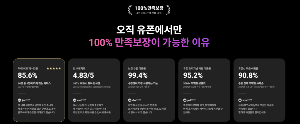 항목별 학습 만족도를 기준으로 오직 민병철유폰에서만 불만족시 4주 이내 환불 제도를 운영하고 있습니다.